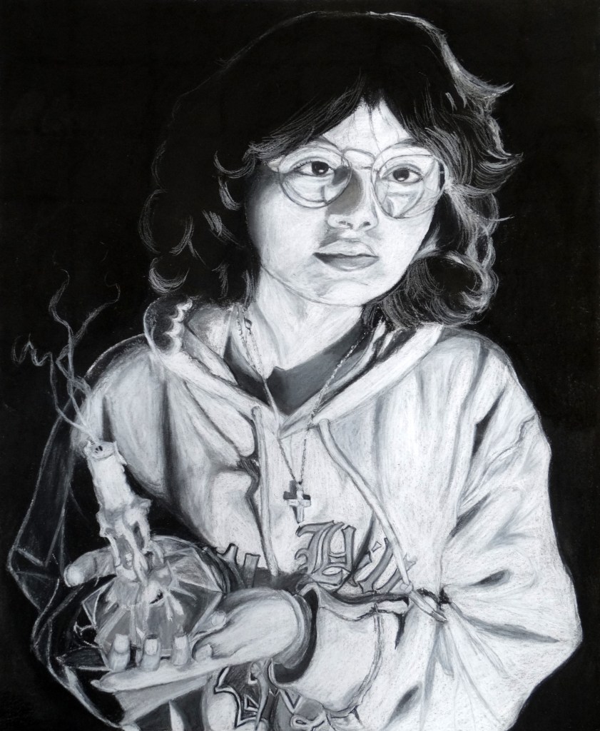 Schorsch will be exhibiting two mixed media pieces in the exhibition. “The Charioteer’s Resurgence” explores grief as both burden and transformation. “The Tempered High Priestess” explores grief as a force that dismantles and reshapes identity. Through mysticism, symbolism, and self-portraiture, Schorsch confronts identity fractured by trauma, allowing grief to guide healing and reveal strength forged through transformation.