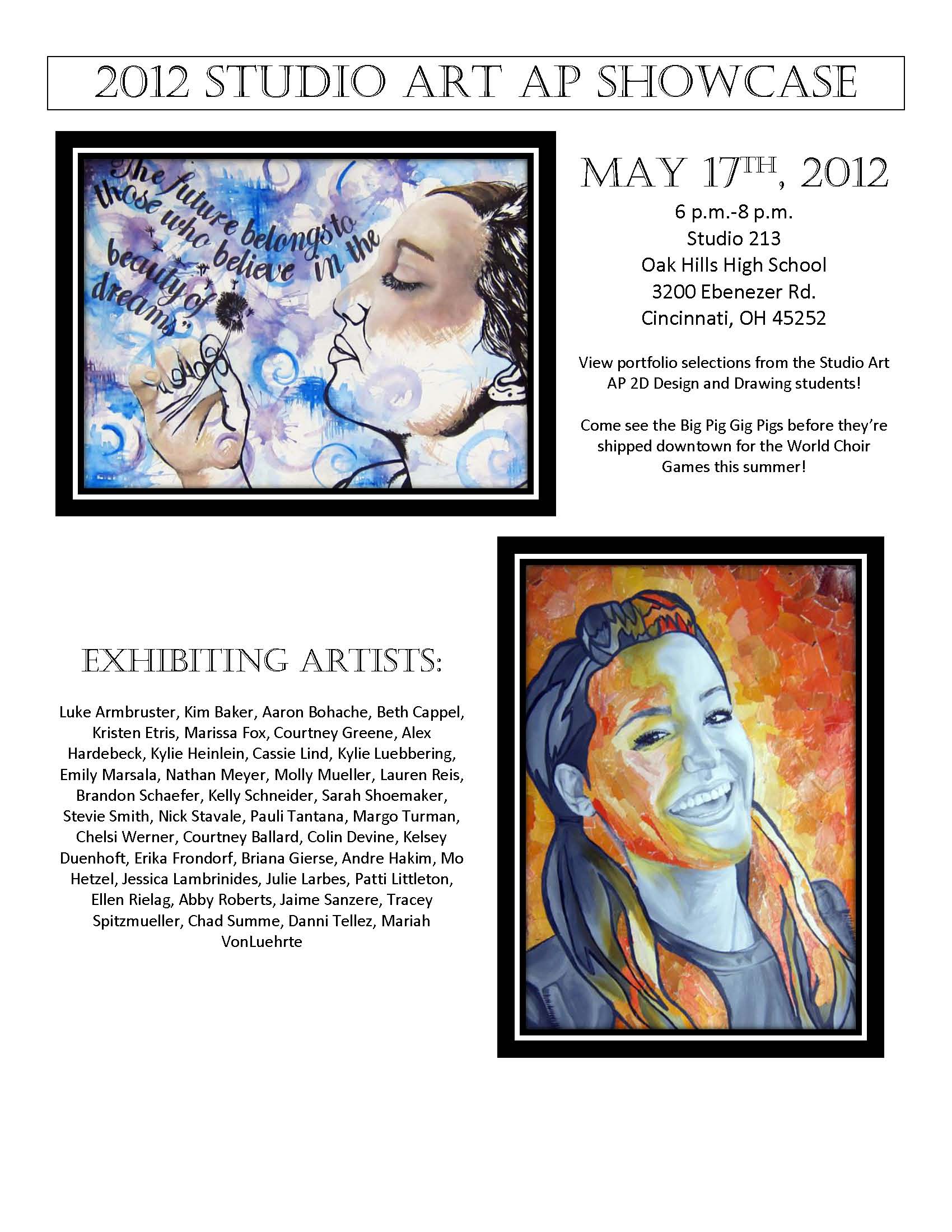 All Oak Hills High School students electing to enroll in an Art and Design Department course will develop a Competitive Advantage, Appreciation of the Arts, Creative Thinking and Problem Solving Skills, Interdisciplinary Connections, Social and Global Awareness, and Career Preparation related to Visual Communication.