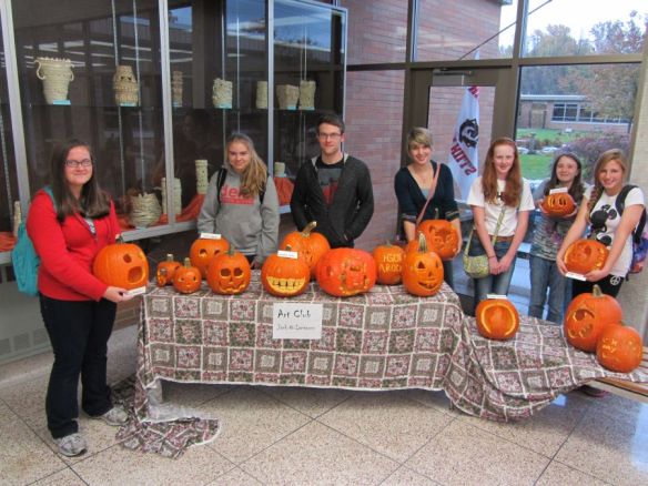 On Thursday, October 18, Art Club got together after school to celebrate the Halloween spirit by creating over 20 Jack-O-lanterns. Here are just a few of the participants with some of the pumpkins put on display that week.