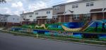 In pursuit of ArtWorks’ goal to paint a mural in every Cincinnati community, ArtWorks partnered with the Villages at Roll Hill to paint the first mural in this neighborhood. The Villages at Roll Hill strives to provide affordable, green housing for its residents. In 2013 the Villages at Roll Hill won a national community development award for its achievements. The design created by OHHS Art teacher Jamie Schorsch, “Growing Community Connections”, illustrates a visual manifestation of the Villages at Roll Hill. The sprawling landscape that signifies the “Green” nature of the communities redevelopment, channels imagery of the varied Cincinnati skylines observable from the Villages at Roll Hill and leads the viewer through a composition that focuses on a variety of aspects of life present in the community. The design emphasis is placed on the transitions of life from infancy to childhood, adulthood, and ultimately senior status; depicted literally through the progressive ages included in the design and also in the transitional values of the sky representing dawn, day, and twilight. Elements related to services provided to the residents of the Villages at Roll Hill are embedded in the imagery, both through the ribbon that creates a unifying thread in the community, activities that figures are engaged in, and the inclusion of the apprentice artist generated icons that represent the multitude of services available to residents. Outreach and philanthropy, dominant in the community, is depicted through the inclusion of community members’ handprints interwoven into the foliage of the design. Schorsch had the opportunity to not only design and lead the project, but work alongside one of her OHHS Art students Alyssa Weber.
