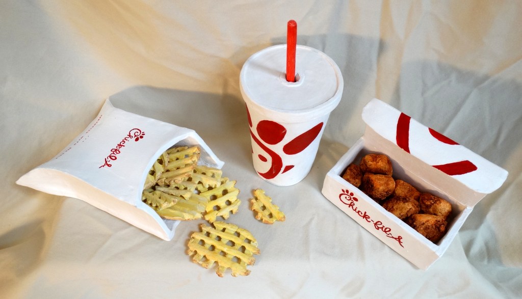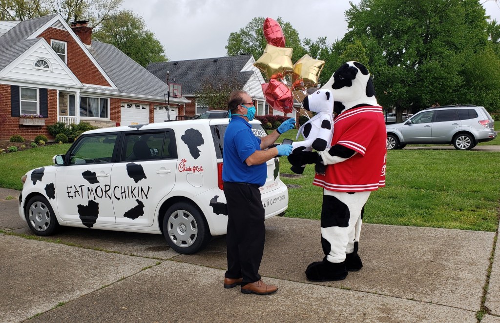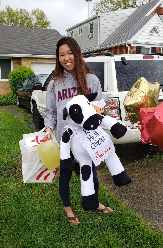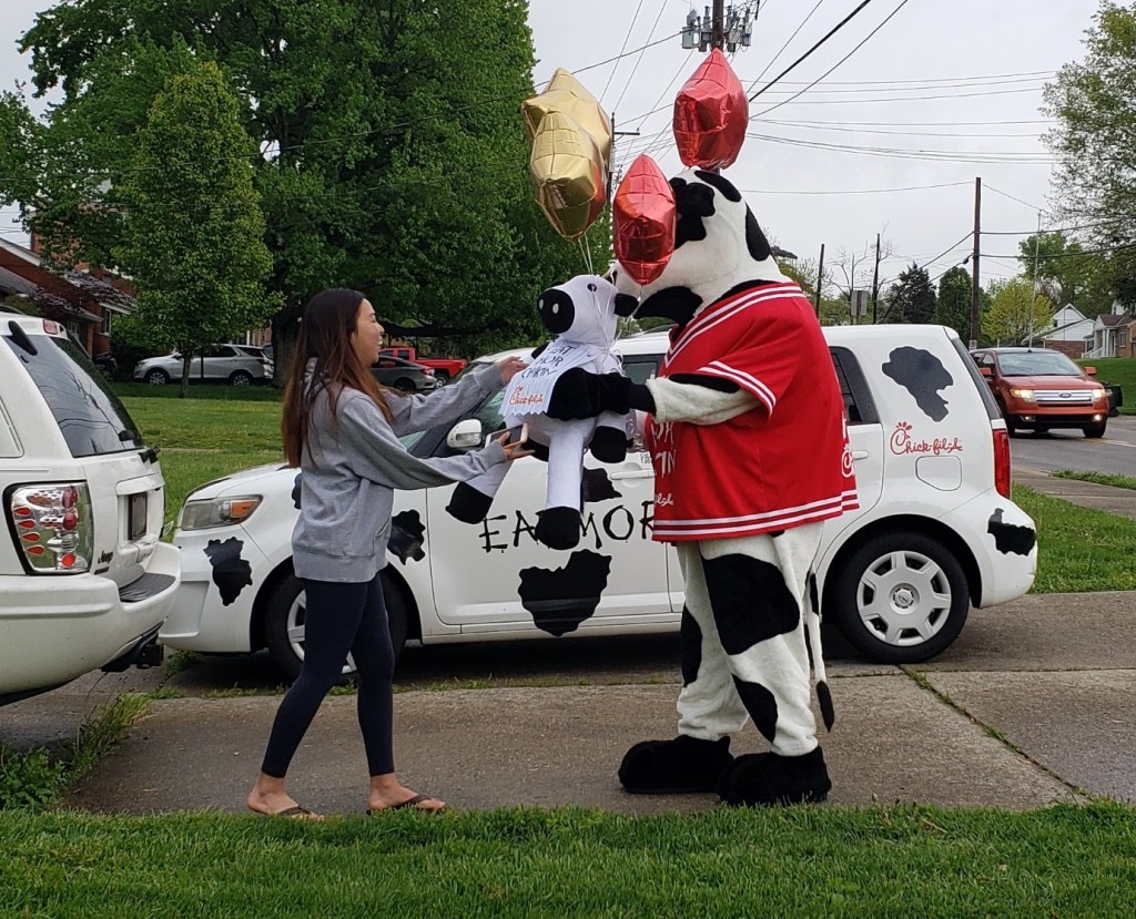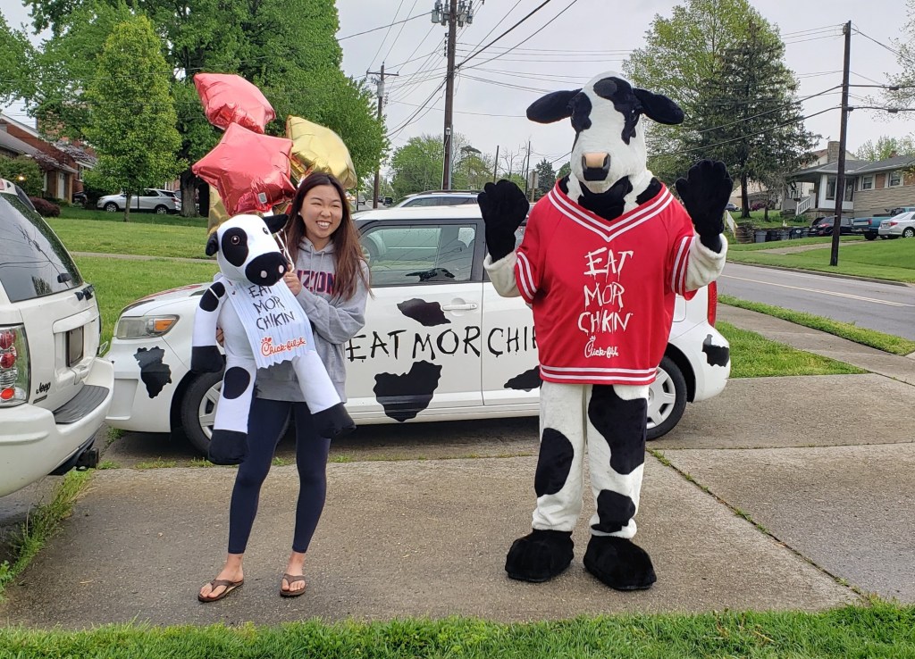 One year ago on May 8, 2020, Susan Park was recognized by our Western Hills Chick-fil-a for her outstanding sculpture of her favorite Chick-fil-a meal; chicken nuggets, waffle fries and a drink. Susan created the ceramic replica artwork in Ms. Dignan-Cummins’ Sculpture class. While the artwork was on display at the District Office, it caught the attention of Glenn Carson, our IT director who shared a picture of it with a contact at Chick-fil-a local corporate headquarters. This got the ball rolling and before we knew it, the Chick-fil-a cow showed up at Susan’s house to recognize her exceptional achievement. Susan and her family were given a certificate, hot meals, gift cards for future meals, a stuffed cow, balloons and more. Thank you Western Hills Chick-fil-a for honoring our students’ hard work.