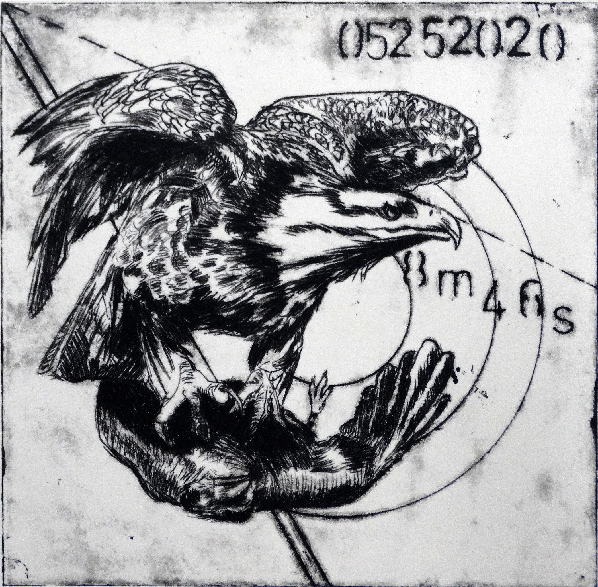 “Impetus” serves as commentary in response to the murder of African American man George Floyd on May 25th, 2020 in Minneapolis, MN. Following the murder, demonstrators, protestors, politicians, and mourners memorialized of 8 minutes, 46 seconds as a way to respond to the death of George Floyd and years of police brutality suffered by African Americans. Since that day, the time stamp has been challenged and changed from 7 minutes, 46 seconds to 9 minutes, 29 seconds, but that end result of the Officers action, and inaction, remains. 8 minutes, 46 seconds exists as the rallying point that inspired change. The American Eagle and Crow carry varied symbolism intended to be perceived either as: abuse of power by those in authority in direct reference to the kneeling on the neck of Georgy Floyd, America attempting to suppress transformation in transcending racist ideologies as symbolized by the Crow, or as Americans uniting in defense of their fellow man against the remnants of the Jim Crow laws.
