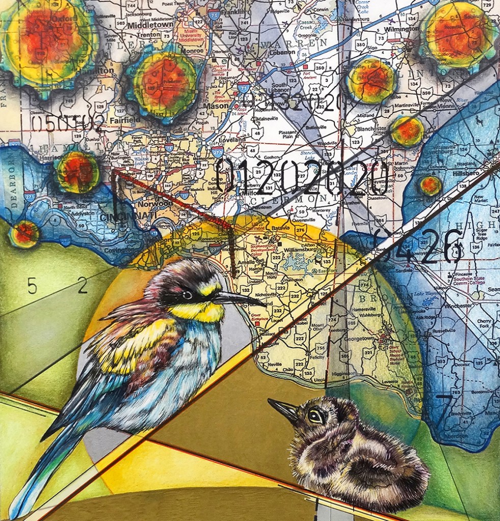 Collaged images of maps were embedded in the background on which images of the birds were rendered. Prismacolor pencil, alcohol marker, acrylic paint, and archival ink were utilized to render the image. Stenciling tools were employed for the addition of numerical elements with varying sizes of archival ink pens to create the illusion of space.