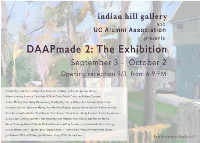 The exhibition is a showcase for the talents within and the alumni of the University of Cincinnati College of Design, Architecture, Art, and Planning (UC DAAP). The curated exhibition of contemporary artwork highlights work created by DAAP alums, professors, emeriti, and graduate students using diverse media and techniques with a focus on innovative trends in Contemporary Art.