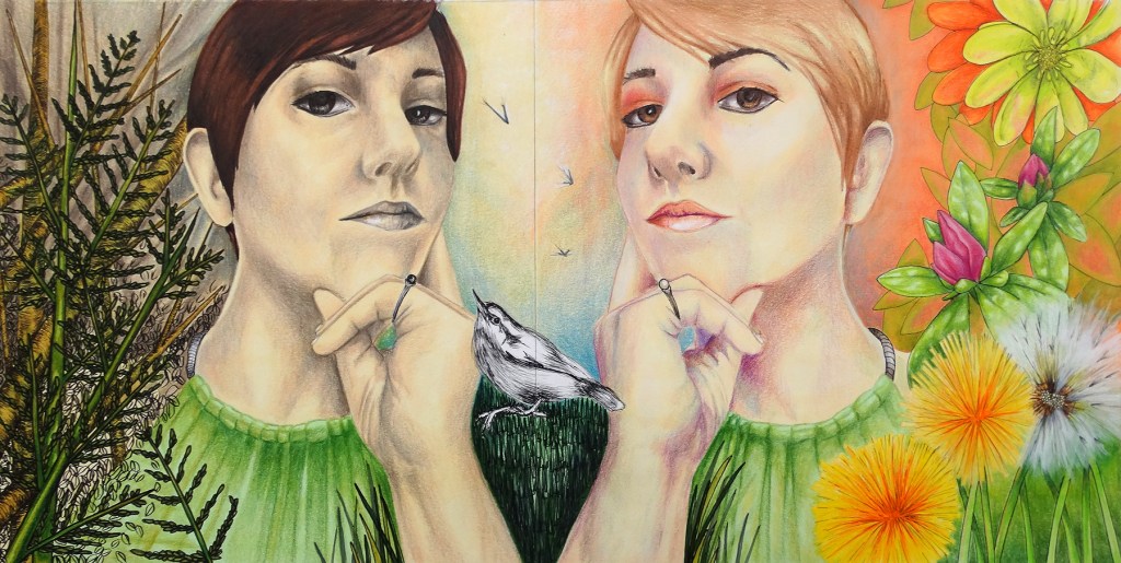Greek mythology attributes the establishment of seasons to the Goddess Demeter, who brings about barren soils and withering crops during the months of her daughter Persephone’s departure and blooms and new life upon her return from Hades. “Persephone” is an autobiographic intrinsic, and extrinsic, evaluation of the personal experiences and concepts of the seasons of life. The lexicon of floral imagery is rooted in symbolism related to the analysis of personal life events that have impacted the construction of my own identity. The narrative piece constructs a conceptual and visual dialogue based upon the dichotomous nature of life, much like the branching of flora themselves. The left side of the double portrait is populated by fallen leaves, sticks, and the cypress; a plant commonly associated with death, mourning, despair, and sorrow. Through varying religions, mythologies, and philosophies, the left side is often associated with darkness, or emergence from darkness, and represents seasons of life characterized by bleakness. The flora on the right side serves to counterbalance the season of despair through the incorporation of azaleas, dandelions, and celandines. Azaleas serve as a representation of gratitude, temperance, and womanhood while the celandines represent joys to come. The dandelion, incorporated for its association with overcoming hardships, is represented both in bloom and in decay in order to emphasize the cyclical nature of the ascending and descending phases of life. To echo the symbolic dialogue, the rendering style on the left of the image is mechanical and desaturated in an effort to emphasize the sense of decay while the right is softly saturated and chromatic to allude to the vibrancy of life. The bird depicted, the Nuthatch, was specifically selected for its symbolic representation of cycling through processes of life events. The Nuthatch serves as a moderator between the phases of life and stands in confrontation with the season of despair or as an observer of the “duet of shade and light” within one’s life.