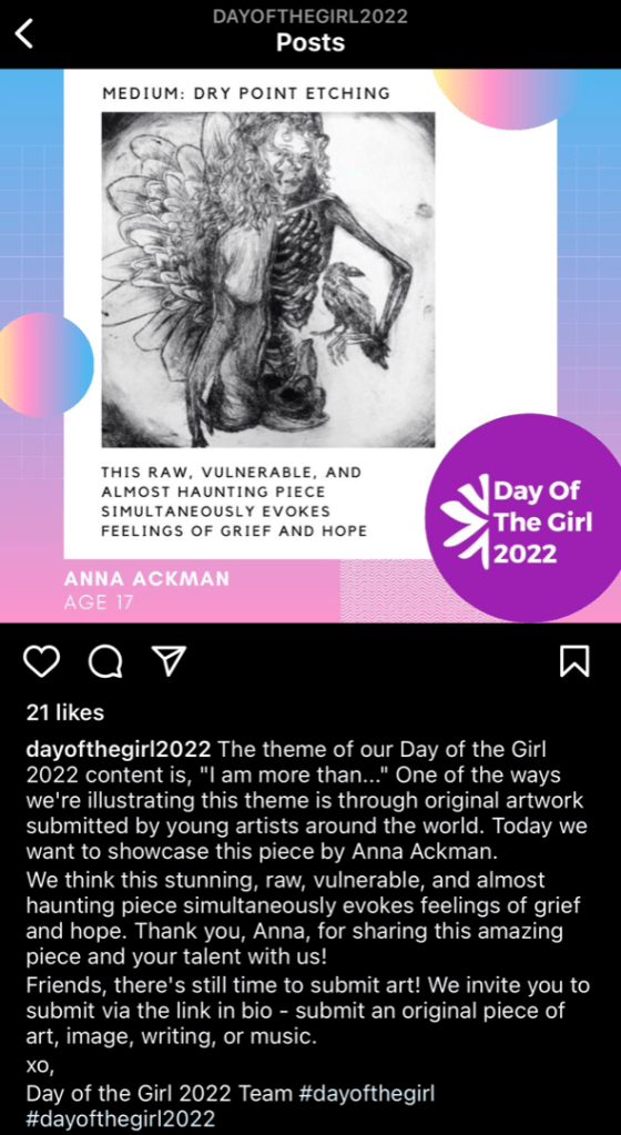 The theme of our Day of the Girl 2022 content is “I am more than..” Through this theme, they are exploring what strengthens us, emboldens us, and inspires us. One of the ways they’re illustrating this theme is through original artwork submitted by young artists from around the world. For the next two weeks, they’ll be showcasing their art on the Day of the Girl social media channels so please check it out!