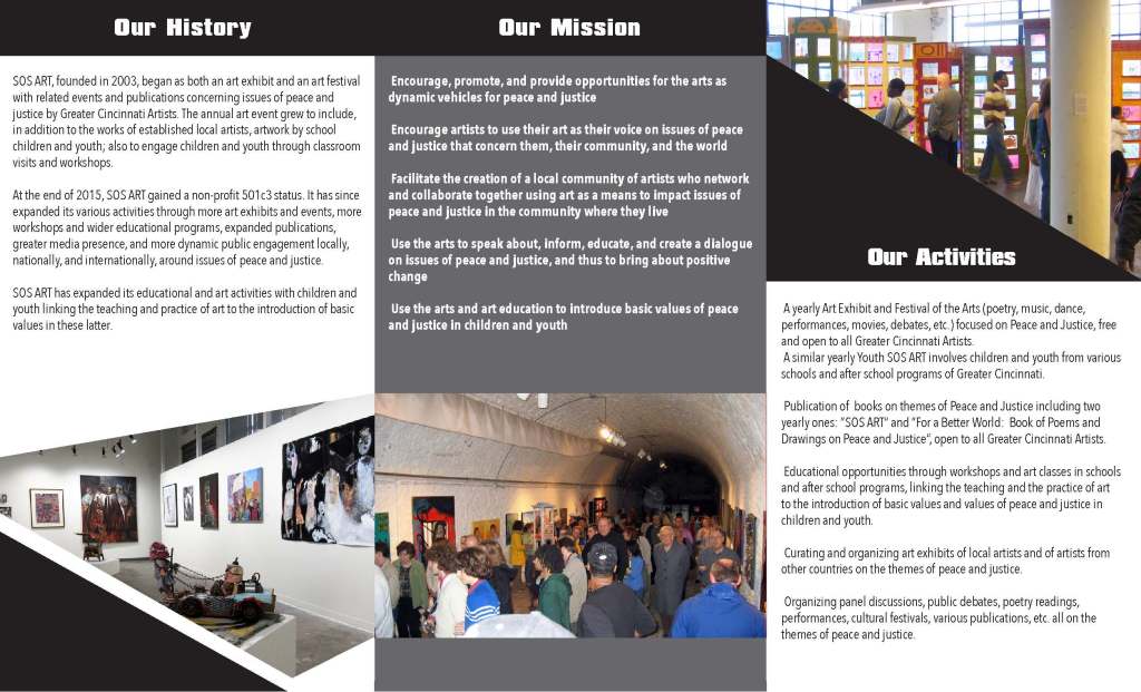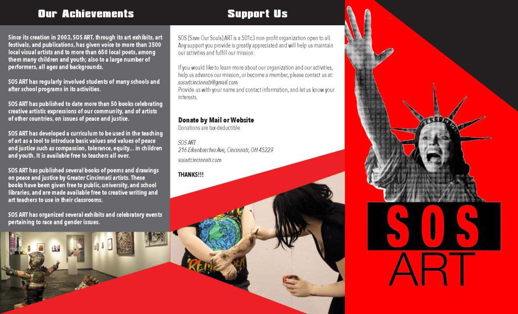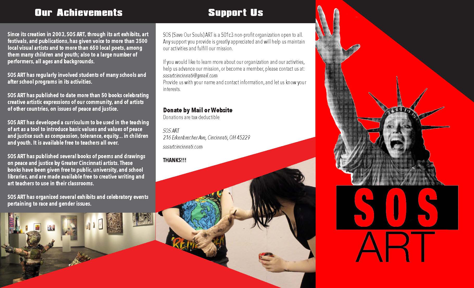 Over the past semester, OHHS Art and Design student Tyler-Tuong Tran worked to create an informational brochure for SOS ART. SOS ART began in 2003 as an art exhibit and an art festival with related events and publications concerning issues of peace and justice as expressed by Greater Cincinnati artists. The annual art event grew to include, in addition to the works of established artists, artwork by school and after-school children; also to engage children through classroom visits and workshops. SOS ART has since expanded its various activities through more art exhibits and art events, more workshops and wider educational programs, expanded publications, greater media presence, and more dynamic public engagement, all around issues of peace and justice.