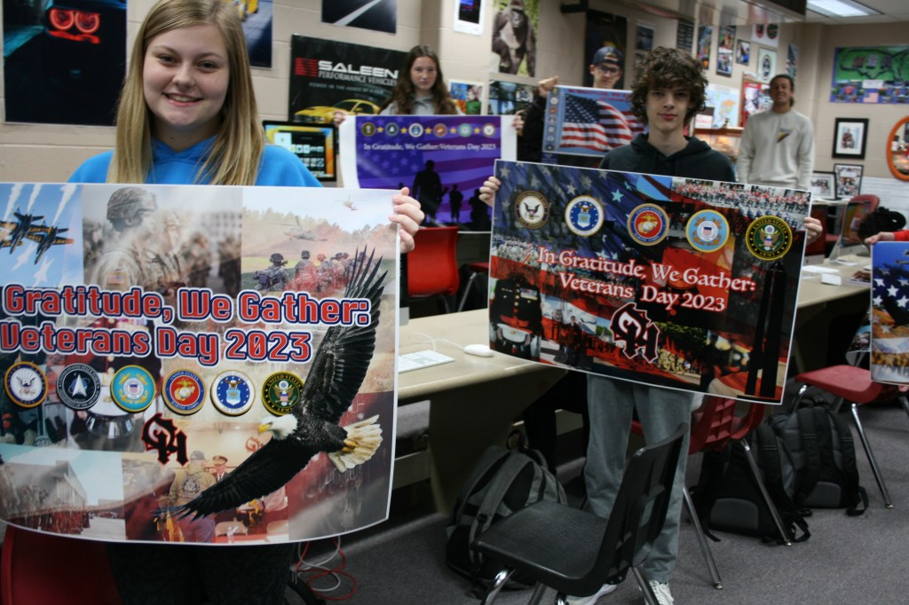 Experience the heartfelt tribute to our Veterans through the lens of artistry in “In Gratitude, We Gather: Veterans Day 2023.” Francine Gibson’s Adobe Photoshop class embarked on a creative journey that culminated in the creation of captivating large format themed posters for the annual OHHS Veterans Day Assembly, which took place on Monday, November 6th. Students meticulously followed the Design Process, starting with initial ideation and research, allowing their ideas to be informed and refined through an iterative journey. From rough drafts to polished final designs, their dedication shines through every step of the way.