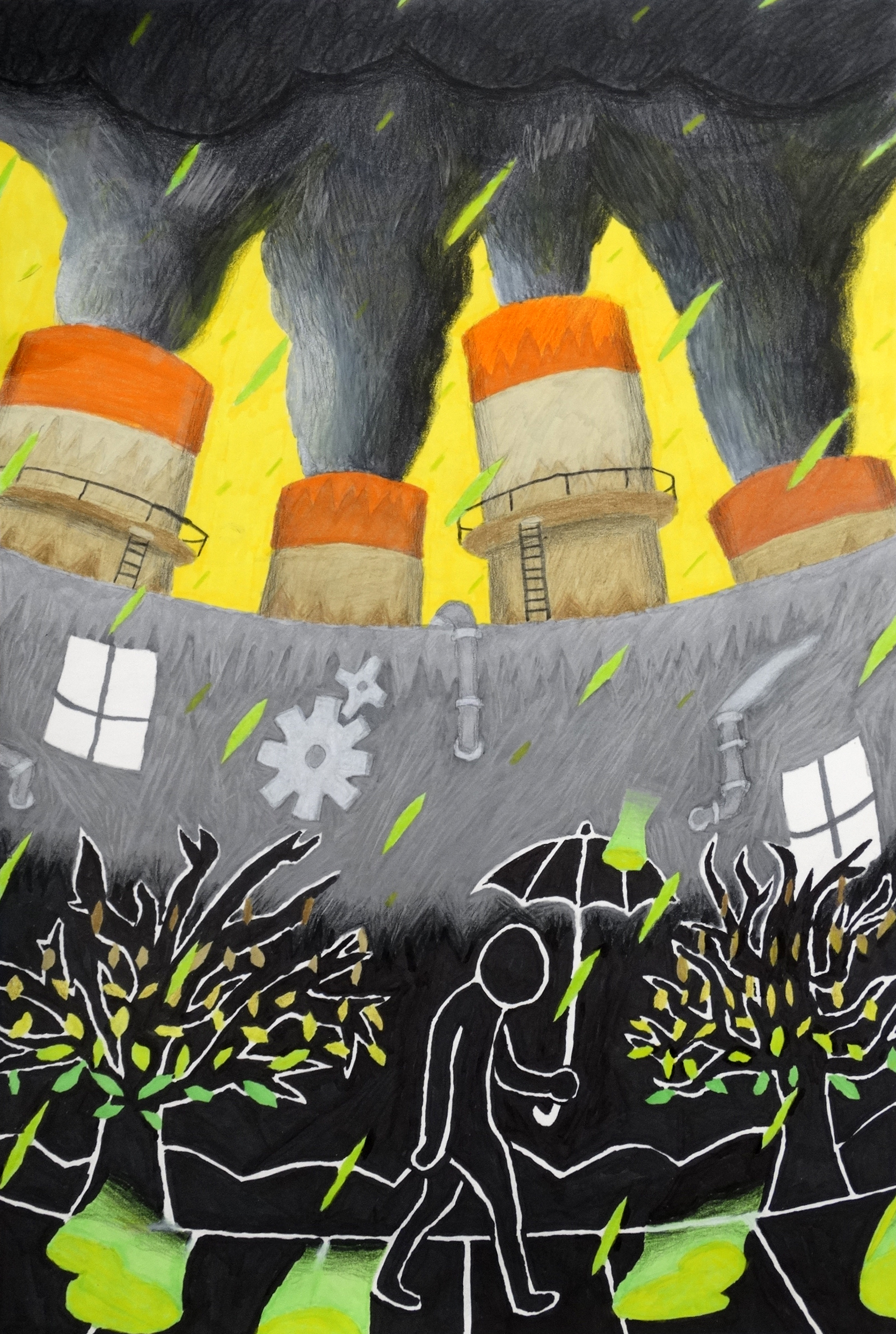 While depicting the beauty of nature and wonders of our planet is great and all, I find showing the dangers and threats posed upon our environments more important, because if awareness of those threats is not spread and made known, no action can be taken against them, and the ability to celebrate the beauty of our planet will be but a distant memory. With this piece, I wanted to show off a threat that is more personal to regions like our own, and especially regions surrounding ours; acid rain. This piece depicts how acid rain is formed in the sky from fossil fuel burnings, but also its effects and the danger it poses to our environment, as well as the equally problematic and more worldwide issue of smog clouds looming over our society. I made the bottom third nearly completely coated in darkness, symbolically showing the dark nature and effects of acid rain, but also showing how the polluted smog clouds born from smokestacks and fossil fuels can leave us in darkness down on the ground as the air and rain gets worse and worse. On the trees, I made it so the leaves begin luscious and green at the bottom, but slowly become more brown and dead as the tree goes up, to show how acid rain kills off and destroys trees from the ground up. On the top half, I wanted the factory and smoke clouds to loom overhead as the person walks by, showing how we are powerless to the destruction of our skies and ecosystems if we don’t stand up and do something, as well as showing the source of acid rain. Of course, this piece is a bit exaggerated, as while acid rain is certainly deadly to the environment, it’s not deadly enough to literally melt the ground below us in acid puddles. However, the intent is merely to show the viewer that acid rain is dangerous and threatening, anyway, and that if we don’t take care of it, environments in regions around the world affected by acid rain will cease to exist, just like how it is shown here.