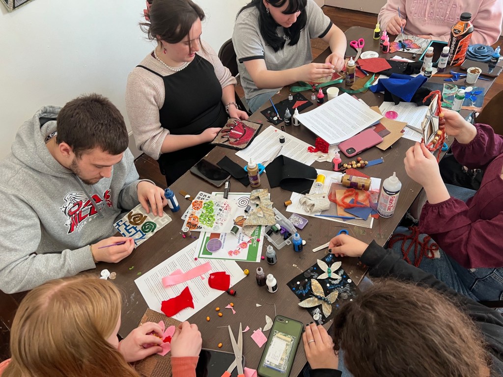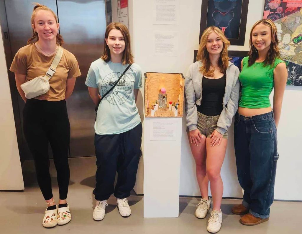 Influenced by the exhibitions Zaha Hadid: A Permanent Nostalgia for Departure and Tai Shani: My Bodily Remains, Your Bodily Remains, and all the Bodily Remains that Ever Were and Ever Will Be Milo Butts, Kalli Langdon, Finley Nguyen, and Rylee Dissinger created works in reaction to and addressing issues of the human form and spaces. Finley Nguyen’s “Cinemas,” represents the inability to separate yourself from the exaggerated online persona you put out to others to reach stardom. Finley’s intention was to portray the emotional distress of acting as a character. They distorted the artwork by integrating multiple media such as magazine clippings, photographs, canvas, and paint. Through “Talisman”, Milo Butts explored the questions of how they could reflect, as a trans person, the forced expectations, and the idea that we are only valued for what we can give, often placed upon myself and others with uteri in society. In “Ghosts of Music Hall”, Kalli Langdon explores the impact of urban legends of spaces and the traces that we leave behind in spaces through collaged digital imagery while Rylee Dissinger explores in “Scaling” the idea of surmounting your goals while also exploring the intersection of art and sports and the existence in two divergent worlds.