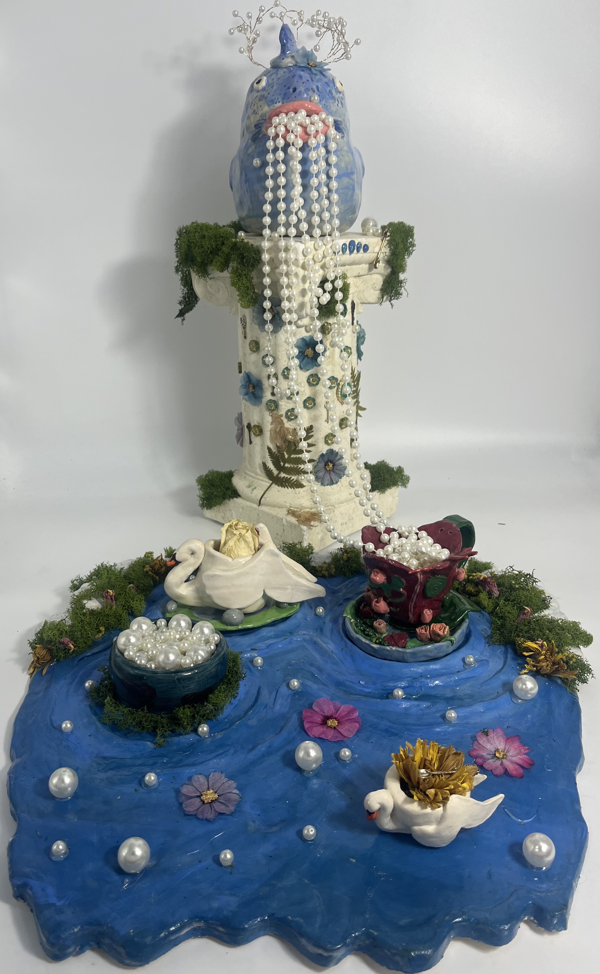 Ms. Dignan-Cummins’ Studio Art 3dAP students collaborated to create a work of art inspired by spaces and the feelings siphoned from the characteristics of that space. Tea Time Treasures is inspired by the hard and soft nature of the realities represented in The Persistence of Memory by Salvador Dali. Working with the topics of melding together, fantasy worlds, and flowing liquid, the work asks the viewer to gather at their tea party. Tea, representing harmony and peace, is the central focus of this classical fantasy world where people of all values come together to gather in peace to discuss the hope for a better world.