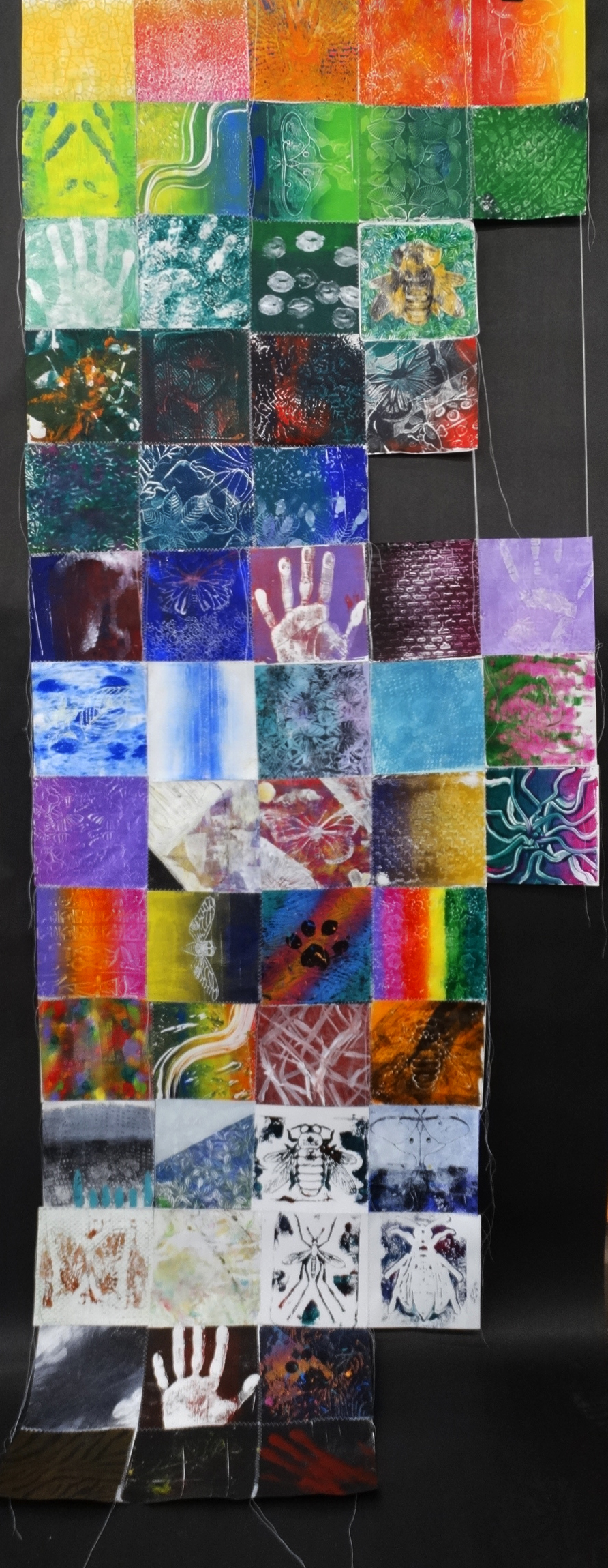 Ms. Jamie Schorsch’s Studio Art AP students collaborated on the creation of a piece influenced by the idea of Zaha Hadid’s ‘Urban Carpet’ and works from A Permanent Nostalgia for Departure. The Imprints We Leave Behind combines the unique impressions each student makes, both personally and on each other, and the forming of community. Inspired by the Wave Pool Gallery exhibition focused on the visualization of community through quilt making, students stitched together the individual elements they created in a design intended to leave the wall and enter the collective space, with the threads left exposed to add an element of entanglement with the viewer.