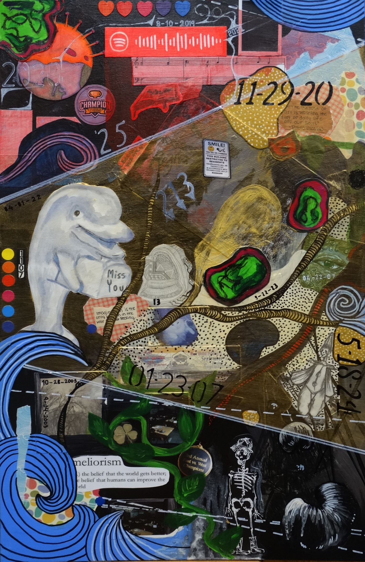Ms. Schorsch’s Studio Art AP students collaborated on the creation of a piece influenced by artifacts influenced by the various artists exhibiting in A Permanent Nostalgia for Departure. Additionally, students drew upon the influence of their visit with artist Michael Thompson and their exploration between nostalgia, personal histories, and remembrance. Students collaged personal pieces of ephemera together to craft an image that represents key points and memories in their life and added numeric coding, inspired by the artwork Ms. Schorsch exhibited in Wounded Healers, to memorialize key dates of significant impact in their lives. The composition was organized to reference the influence of the architectural design of the Contemporary Arts Center and represent the building of your own life.