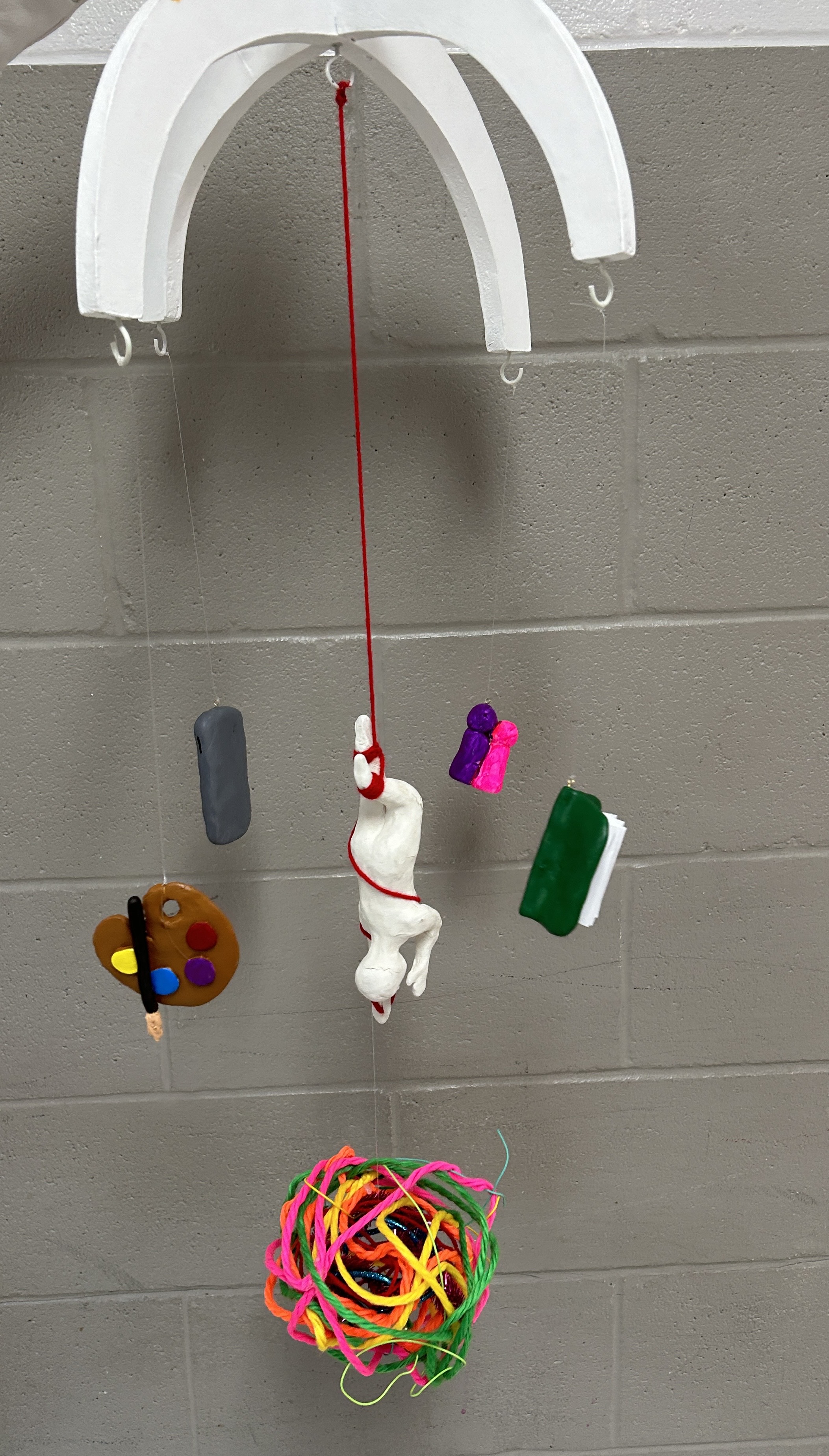 Ms. Dignan-Cummins’ Studio Art 3dAP students collaborated to create a work of art inspired by spaces and the feelings siphoned from the characteristics of that space. The Pursuit of Happiness plunges into the conceptual journey each of us has when embarking upon our future beyond high school. The work visually represents an individual being tied to the superficial aspects that seem to hold them back from their determination to reach their fullest, untethered potential. Surrounded by the swirling components of day-to-day life, the viewer is challenged to consider what they would reach for as the brightest & most meaningful version of their life.