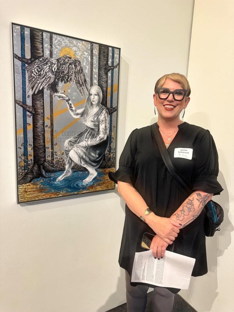 This week the Cincinnati Zonta Club Chapter’s “Journey to Healing” exhibition opened at the Contemporary Arts Center. This exhibition, which explores the role of art in overcoming trauma and gender-based violence, offered a platform for Schorsch and her former student, Autumn Shelton (’18), to display powerful works addressing these crucial issues in relation to personal journeys. Their artwork added to the conversation about healing through creativity.