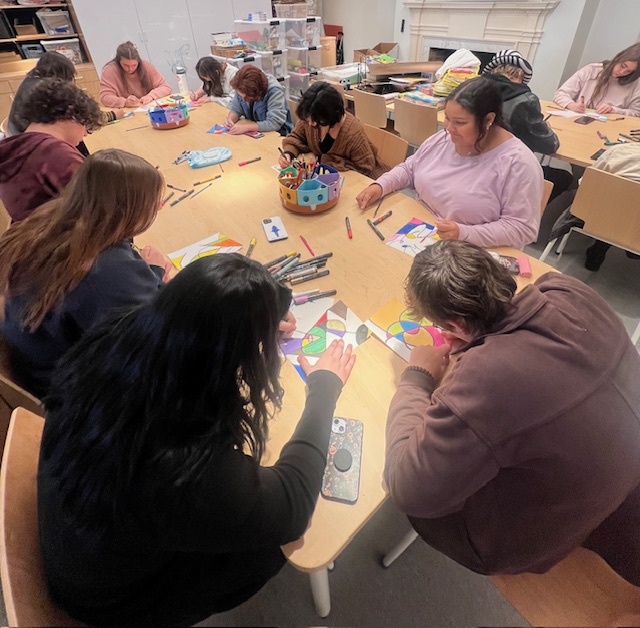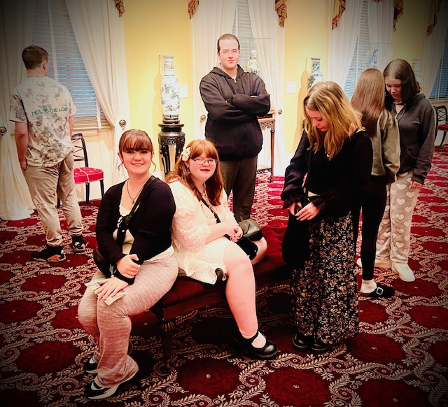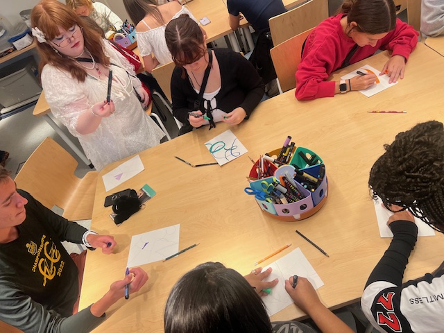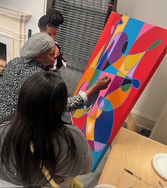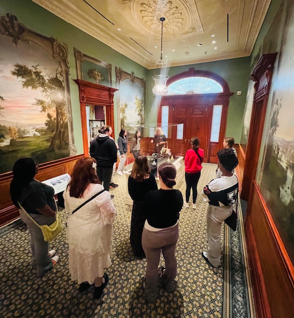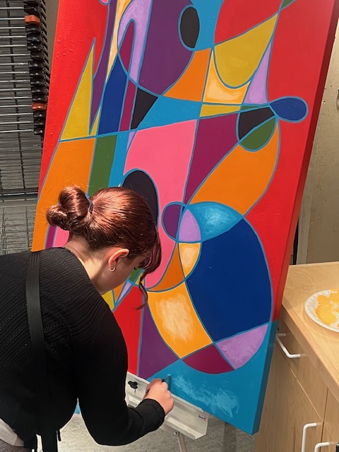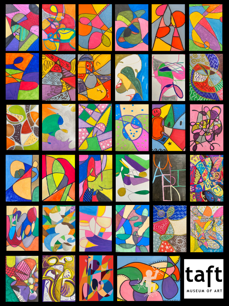 The Drawing and Printmaking students recently visited the Taft Museum of Art where they engaged in docent-led tours of the galleries and worked alongside Cedric in the studio. Students synthesized Cedric’s approach in generating the composition for the collaborative piece the classes are painting together and created individual designs based upon the abstraction of their initials. This was the first time that most of the students had ever visited the community treasure that is the Taft Museum of Art!