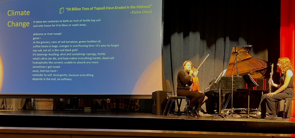 Students were able to gain insight into the ways that democracy works in our everyday lives through musical and extra-musical demonstrations. The interactive performance was accompanied by the reading of poetry and the projection of visual art by greater Cincinnati Artists, addressing the same themes.