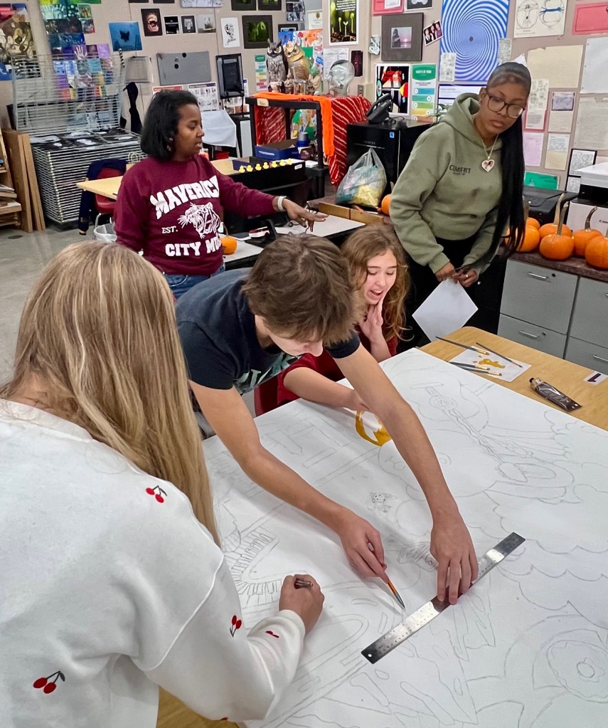 After spending their first visit getting to know Adoria and brainstorming about the things they experience in their daily environments, or what they find impactful about objects they interact with on a daily basis, they created a collaborative design synthesizing their different perspectives. During this week’s visit with Adoria, they began laying out their design and blocking in color. Over the next few weeks, the Drawing and Printmaking students will continue their collaboration in preparation for the winter exhibition of their work at the Taft Museum of Art.