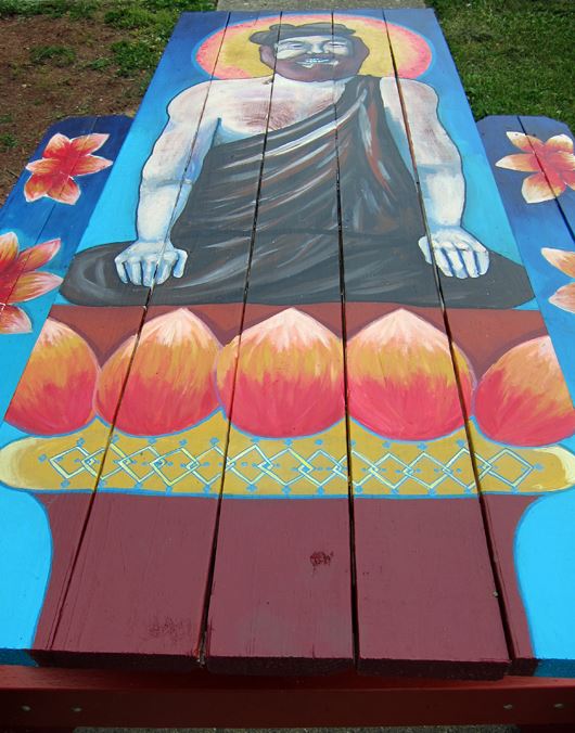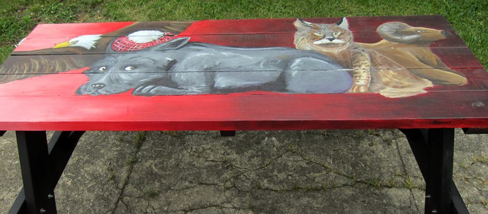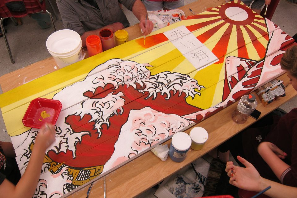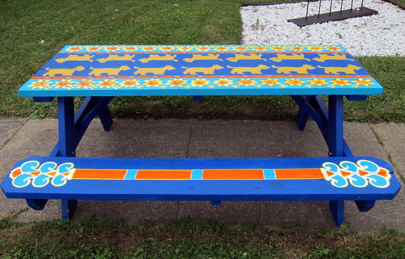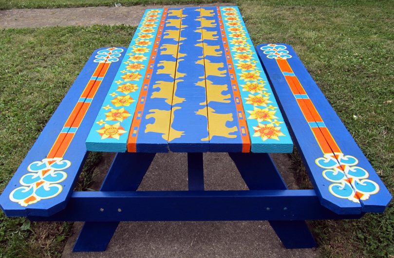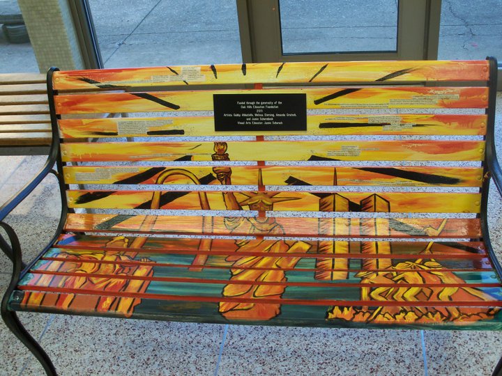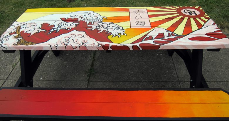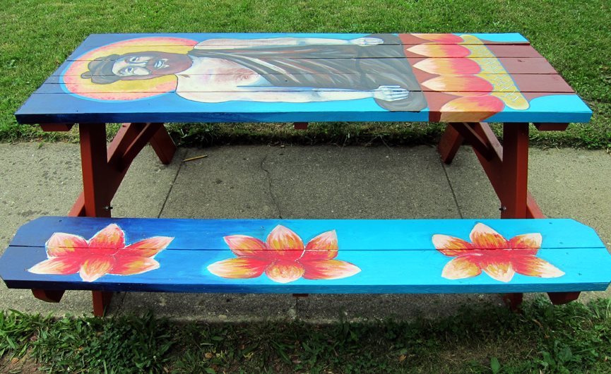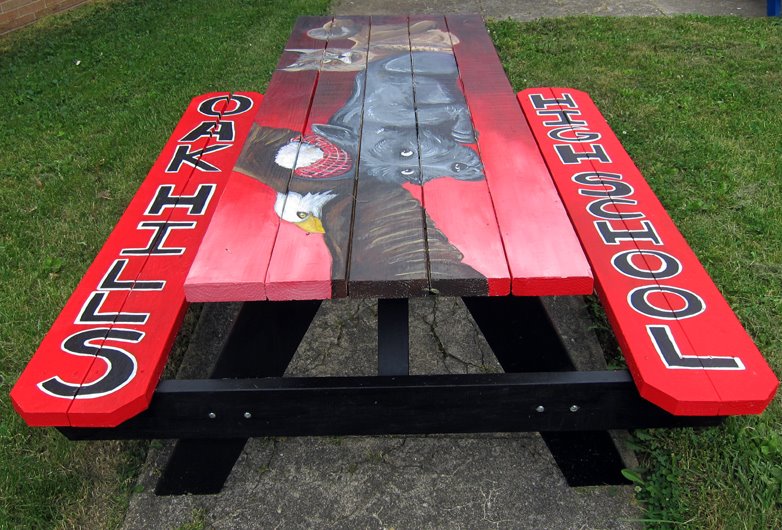 The students were given the directive to research, and chose, an image or artist from Art History to reference and adapt for their original picnic table design. Stylistic and technical inspirations represent a range from Art Beyond the European Tradition- the classes studied the works of Chinese, Japanese, Indian, and Islamic artworks for inspiration. Styles of representation provided inspiration for the rendering of images that were intended to reflect students’ interpretations of both the Oak Hills and Greater Cincinnati community they belong to, symbolically.
