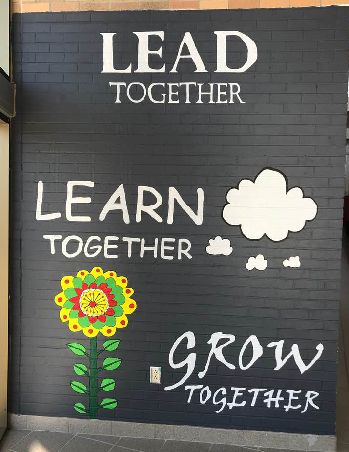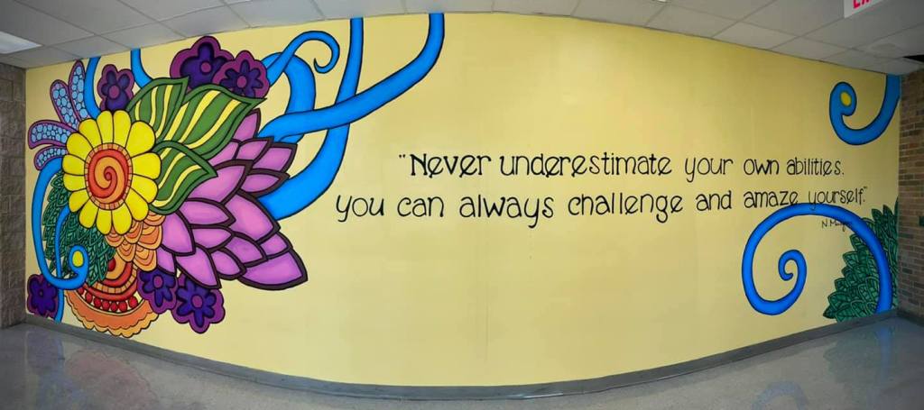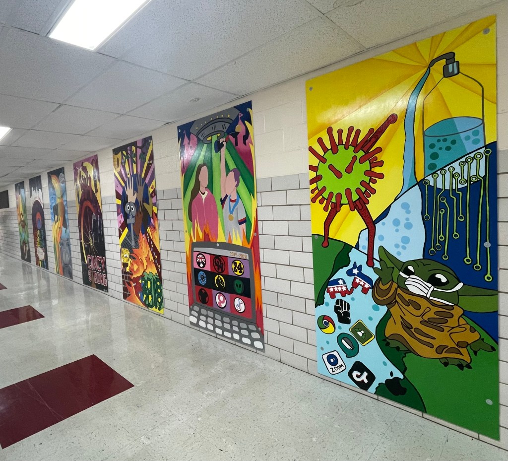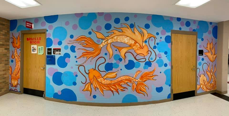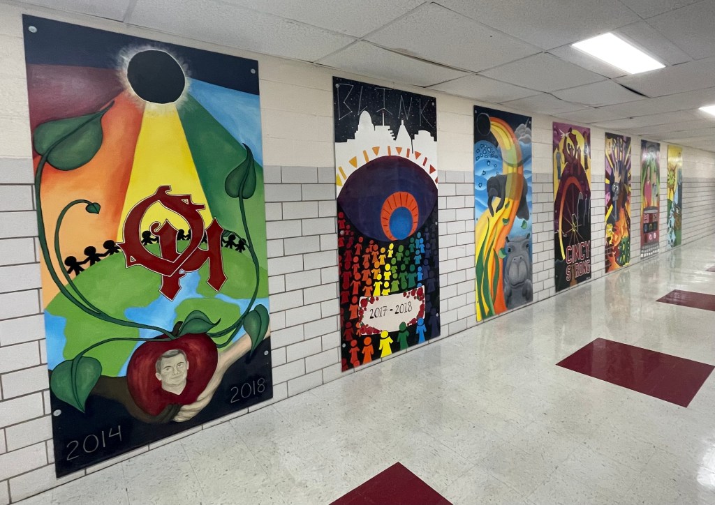 The mural is now tucked behind the graphic overlay in the front lobby of OHHS.