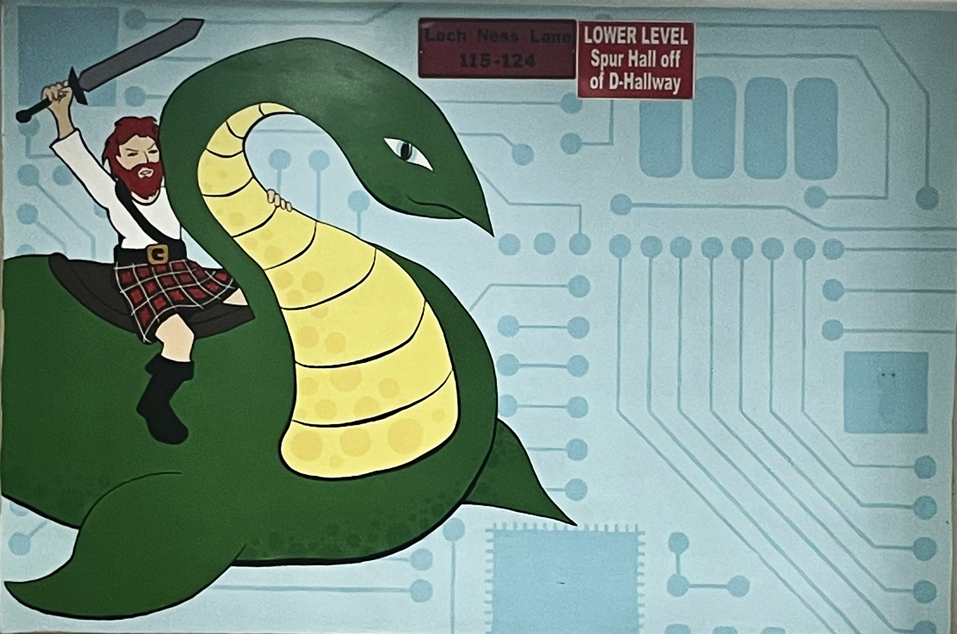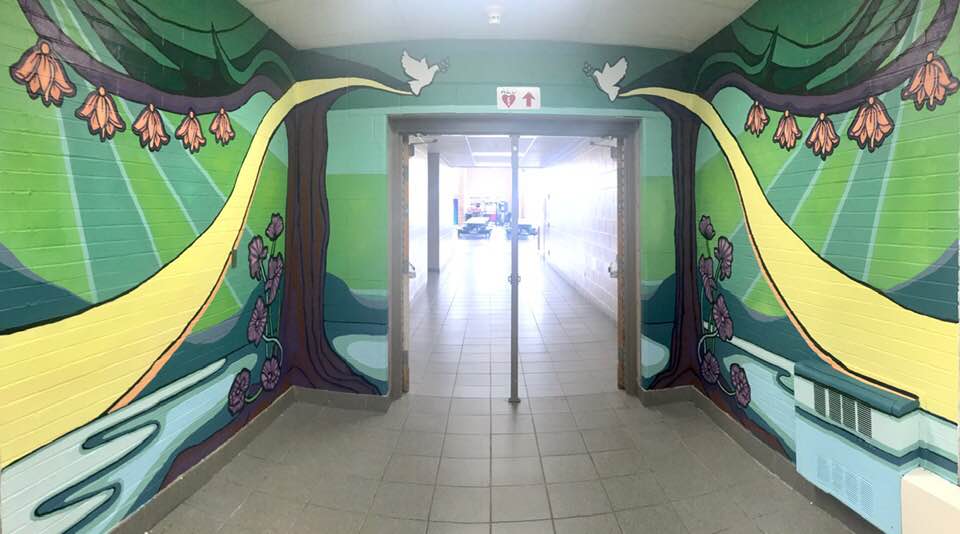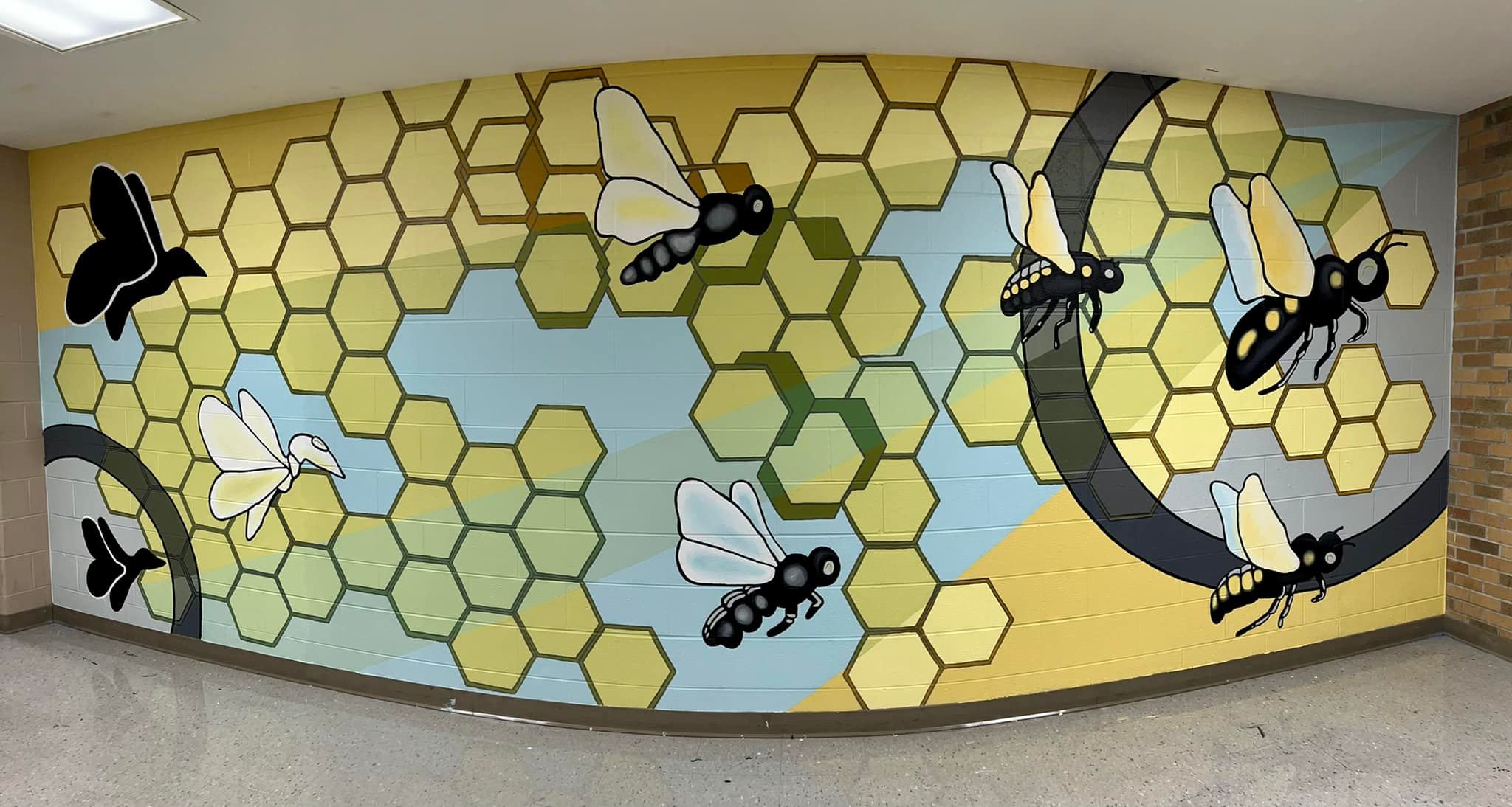 The mural is now tucked behind the graphic overlay in the front lobby of OHHS.