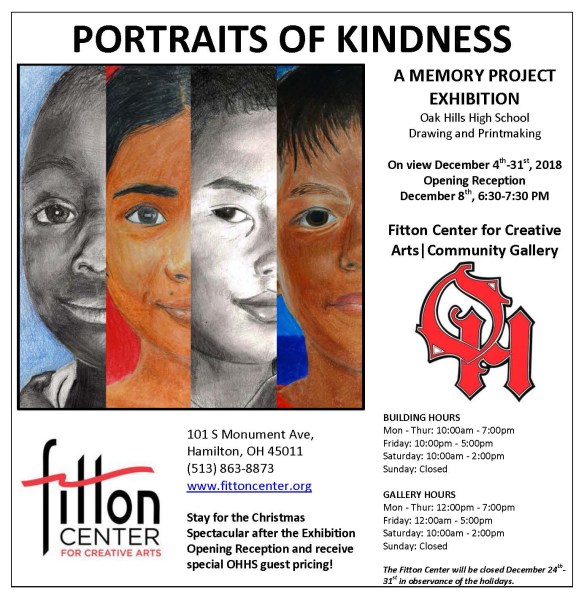 Some of the Drawing and Printmaking, and NAHS, students recently had the opportunity to visit their exhibition today at The Fitton Center for Creative Arts. Students reflected on their experience with creating this year’s Memory Project portraits which will be mailed out for delivery in January. “Portraits of Kindness” will be on exhibit throughout the month of December.